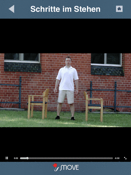 Viel Aufmerksamkeit wurde in der App den Übungen zur Beweglichkeit gewidmet. In Zusammenarbeit mit einem auf Parkinson-Therapie spezialiserten Physiotherapeuten wurden in der Parkinson- Fachklinik Beelitz-Heilstätten Videos erstellt, die anhand von 21 Übungen aufzeigen wie Patienten mit einfachen Mitteln und im heimischen Umfeld ihr Training gestalten können. Kraft, Kondition, Gehen spielen dabei eine genauso große Rolle wie Feinmotorik und Gleichgewicht. Als Kulisse wurden Außenan – lagen genutzt um dazu anzuregen, viele Übungen im Freien auszuführen. Die Videoreihe wird zukünftig erweitert um Beispiele für Übungen in der Wohnung und Anwendung von Hilfsmitteln. Anregungen aus dem Kreis der Patienten, Angehörigen und Therapeuten sind willkommen. (Abb. 2 und 3)