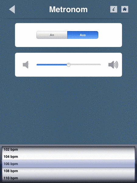 Zur Unterstützung der Alltagsaktivitäten wurde die App mit ein paar wichtigen Hilfsmitteln ausgestattet. Ob beim Tanzen, in der Musik oder in der Parkinson Therapie – Rhythmus ist eine wichtige Grundlage für die Gesamtdynamik der Beweglichkeit. Zur rhythmischen Stimulation der Bewegung (z. B. beim Gehen), ist in der App ein Metronom eingebaut. Der Takt wird sowohl akustisch als auch über eine Vibrationsfunktion übermittelt. Alle Parameter sind individuell einstellbar, d.h. sowohl die Frequenz, die Lautstärke als auch die Vibration – ein einfaches Hilfsmittel mit einem großen Nutzen für den Patienten. (Siehe Abb. 4)