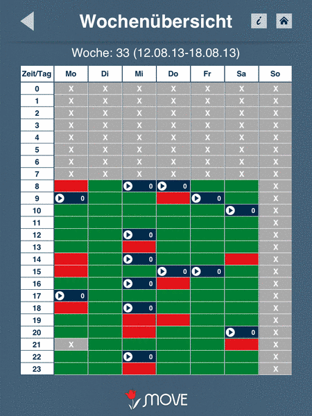 Eine weitere Innovation ist das elektronische Bewegungsprotokoll. Dies ist für Arzt und Patient ein wichtiges Hilfsmittel zur Abbildung der Beweglichkeit im Tagesverlauf. Unterschieden werden ONZeiten (mit/ohne Unruhebewegungen) und OFF-Zeiten sowie Schlafphasen. Neben der Erfassung der Beweglichkeit kann auch die Stärke der Unruhebewegungen dokumentiert werden. Diese Informationen dienen zur Erfassung der Motorik über einen längeren Zeitraum und unterstützen den Arzt bei der medikamentösen Feineinstellung. In dieser ersten App-Version wird ein Bewegungsprotokoll inklusive einer Wochenübersicht bereitgestellt. Außerdem besteht die Möglichkeit, ein Video aufzunehmen, das gekoppelt an die Einträge im Bewegungsprotokoll abgerufen werden kann. Die Videos sind zurzeit auf zehn Sekunden Aufnahmezeit begrenzt und berücksichtigen dabei die Speicherkapazität des jeweiligen Gerätes. Nutzen Sie dieses Tool um mit Ihrem Arzt den Wochenverlauf zu besprechen. (Siehe Abb. 6 und 7)