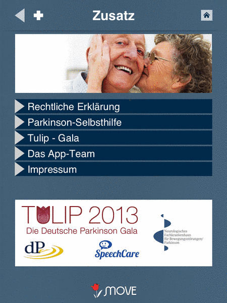 … werden immer häufiger auch in der Medizin genutzt, um Patienten mit Informationen und Hilfestellungen zu unterstützen und die Zusammen – arbeit zwischen Patient und Arzt zu intensivieren. Um auch Menschen mit Parkinson einen schnellen und mobilen Zugriff auf Anwendungen, die den Alltag mit Parkinson erleichtern zu ermöglichen, wurde das MoveApp-Projekt gestartet. Die Move App für iPad und iPhone (Android ist in Planung) bietet kompakte Informationen zum Thema Parkinson, Übungsvideos und Hilfsmittel wie Bewegungsprotokoll, Sprachbrett und Medikament-Enerinnerungsfunktion. Die MoveApp wurde enger Abstimmung mit der Deutschen Parkinson Vereinigung gestaltet und steht dank der finanziellen Unterstützung durch Tulip/Deutsche Parkinson-Gala kostenfrei zum Download zur Verfügung.