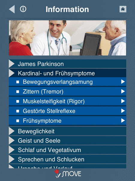 Mobilität ist eines der Schlagworte unserer Zeit, vor allem dann, wenn es um Smartphones und Tablet PC mit den dazugehörigen Apps geht. Auch im Bereich der Medizin bieten mobile Anwendungen neue Möglichkeiten der Information und Unterstützung im Alltag. Unter der medizinischen Leitung von PD Dr. Georg Ebersbach, Beelitz Heilstätten, wurde jetzt die MoveApp gestaltet, die gezielt Menschen mit Parkinson im Alltag unterstützen soll und jetzt im AppStore zum kostenlosen Download bereit steht. Die Menüstruktur der App ist klar gegliedert und bietet aufgrund besonders großer Buttons eine einfache Auswahl beim Einstieg. (Abb. 1) Der Bereich Informationen bietet eine Übersicht über das Krankheitsbild und ist ausgerichtet für Betroffene und deren Angehörige. Die Erklärungen sind verständlich geschrieben und prägnant formuliert. Dabei wurde besonderer Wert darauf gelegt die Schriftgröße, Typografie und Farbe so zu wählen, dass ein Maximum an Lesbarkeit für iPhone oder iPad erzielt wird.